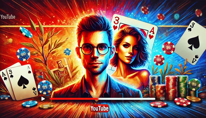 "Нужна генерация картинок в для ютуба. В нужном для заставки на видео расширении. Ниже два файла - девушка как пример. Я, в очках, хочу быть в такой же цветовой гамме и обработанный в похожем стиле. Сгенерируй картинку, пожалуйста, где слева я, справа девушка в покерной стилистике"