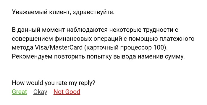 Я специально заново делал недавно депозит с карты Тинькофф, через 100-й процессору (другого у меня там нет). Типа, вдруг какая-то "привязка" сломалась.