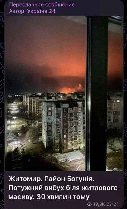 Еще ракетные удары. По словам моего друга очевидца - горит 95-я десантная бригада (ну в смысле военчасть - бригада видимо давно на задании) в на Богунии ( это район города). Горит все вплоть до роддома рядом.