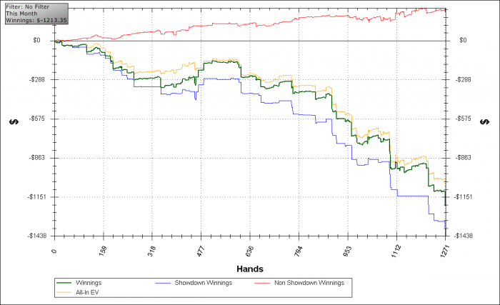 Здесь он решил начать меня 2х 4-бетить, но это только второй-третий раз из последующей серии, так что я не знал его диапазон. Но судя по тому, что дальше он показал A2o, на ривере у него в 110% случаев НЕ БЛЕФ, да и он явно не на блефах зарабатывал в этом матче: