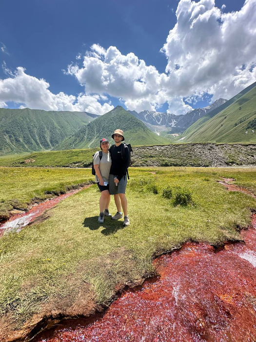 Долина Трусо - это место окружённое горами со всех сторон. Красотища невероятная. Оставили машину на парковке и пошли трекать. По пути встретили озеро с сероводородными источниками. Бурлящее озеро было ярко голубого цвета, а ручейки источников были ярко кроваво красные. Интересное явление. Озеро бурлит из-за углекислого газа, так называемая природная газировка, а источники имеют такой необычный цвет за счёт содержания железа.