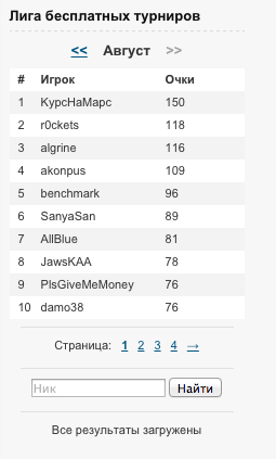 Добавил в таблицу лидеров лиги фрироллов https://www.gipsyteam.ru/rakeback/special-offers/354-liga-besplatnyh-turnirov отчёт за 9 августа.