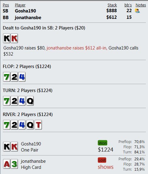 а вот это не интересные руки, но такие как раз идут в большинстве. ХА с лакожопым румыном, где он от 4бб выигрывает удваиваясь 3 раза подряд. 2 последние руки просто одна за другой.