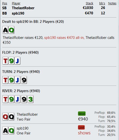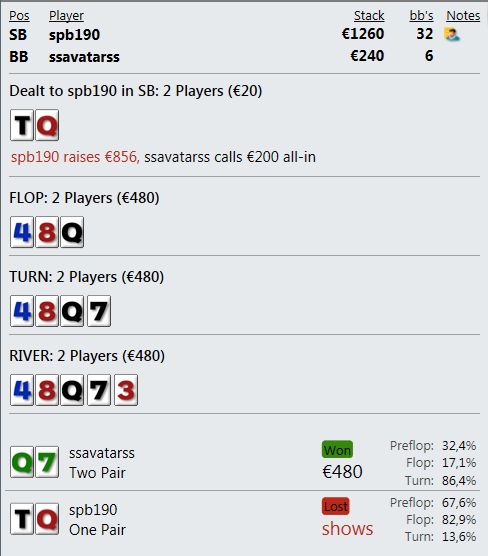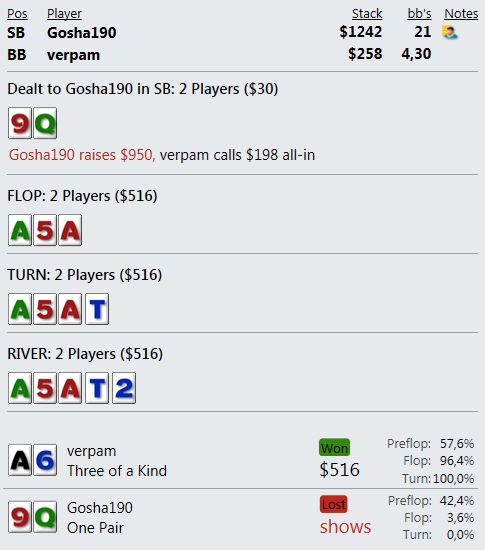 что может быть слаще, чем выиграть х6 у агрессивного наглого поляка с 700+ ЕВ фишками? В 3 макс рук не было вообще, да и потом выиграл всего 2 шд за игру. Один префлоп олын с 64s с огрызком в 9бб - единственная приличная рука к тому моменту. Выставился против А3 и затащил монетку, а вторая - финальная - ниже приведена.