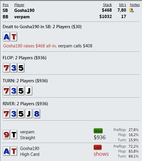 В этом месяце это очень интересная рука и редкая. Я чуть не впервые смог выиграть префлоп выставление у Ах руки с кармашкой! Готов выслушать замечание. На какой улице применил не то действие или ошибся с сайзингом? Опп довольно агрессивный перуанец.