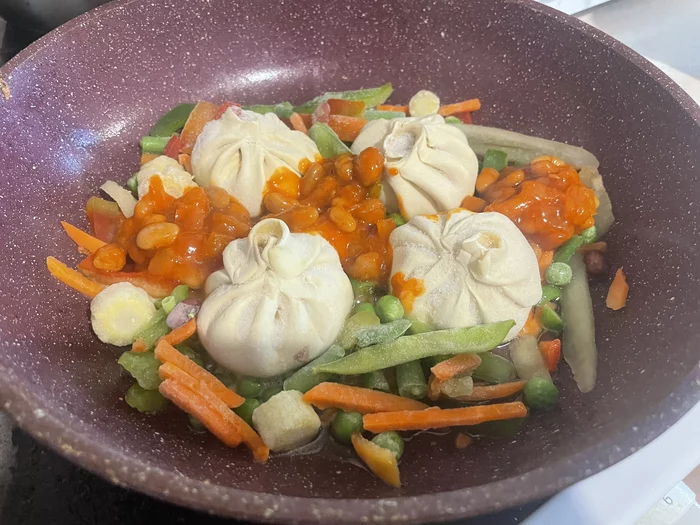 stiket, Бузы, карибская смесь, пара ложек печеной фасоли в томатном соусе. Пара ложек сметаны. Заливаем водой. 20 мин на среднем огне. И вуаля.