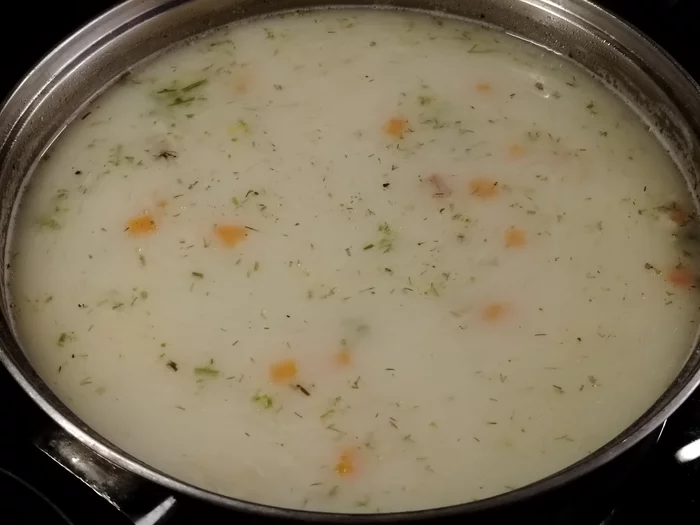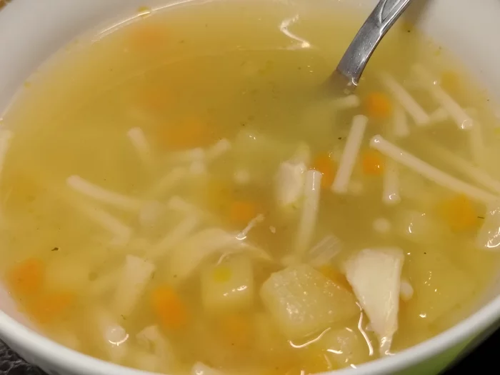 Всё стандартно. Сварил курицу (у меня 2 голени было). Голень достал. Нарезал картошку, лук, морковь - всё в бульон. Мясо с голени снял, нарезал мелко и туда же. Когда картофель сварился - горсть некрупных макарошек, можно поломанного роллтика. И плавленый сыр, лучше тот, который в банке, типа "Ласковое лето". Ну и зеленушечку. Специи по вкусу, главное много соли не сыпь, сыр солёный тоже. Лучше в концовке подсолить.