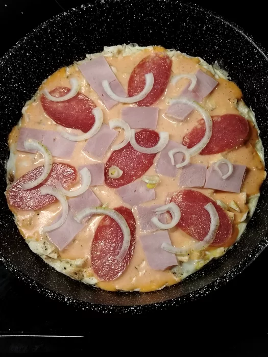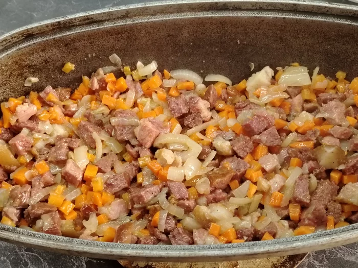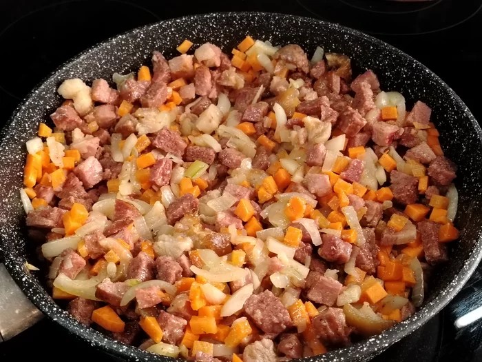A_NAVI40K_K, у меня было мясо рульки варено-копченой и кольцо варено-копченой колбаски. Порезал и на сковороде на средней температуре обжарил. Добавил нарезаный лук и морковь. Немного пожарил всё вместе с приправами.