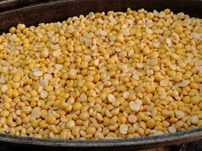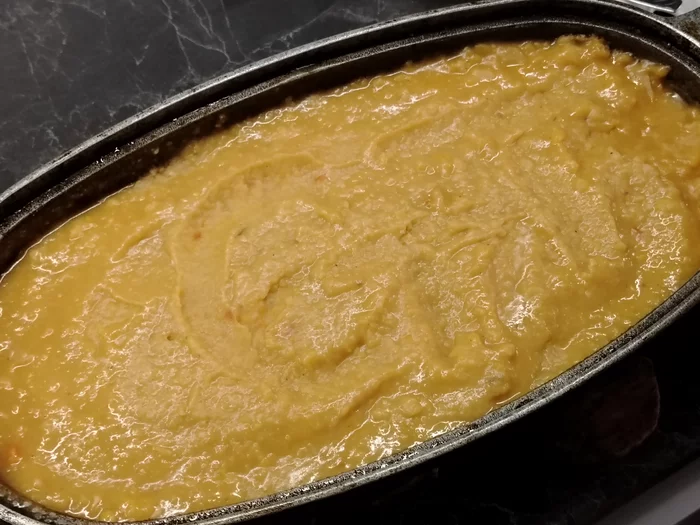 Залил почти горячей кипяченой водой, чтобы поверх гороха на палец. И в зазогретую до 150-160 духовку с нагревом сверху и снизу.
