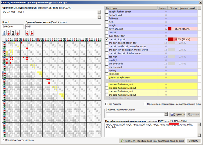 У меня диапазон колла против него 77+, AQ+. Отсюда он ничего никогда не бьет играя чек/колл, ривером он возможно доберет с QQ, 99 при доезде гатшота или флеша, и то не факт, что я заплачу(я умею кнопку фолд нажимать, а ее нажму, если у меня не будет Q червовой, но на счет закрывшегося гатшота будут сложности). Терном я поставлю только AQ, AK(и то временами я их колить на флопе не буду) ну и + сеты. А 2-м баррелям он запросто выбьет АК, 77,88, TT, JJ. (причем изи) Все проскакивает.