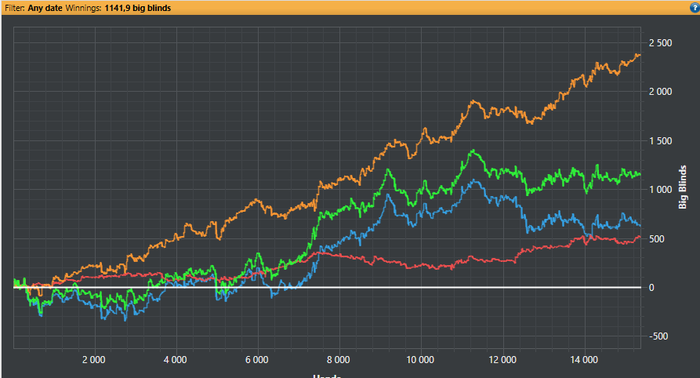 дела в покере обстоят по меньшей мере ужасно - начиная с конца августа, насколько я помню, я не сыграл еще НИ ОДНОЙ плюсовой сессии. Думаю, тут и даунстрик вкупе с моей далеко нелучшей игрой сделали свое дело. Положительная тут сторона только в том, что играю я довольно мало. Пришлось вывести бр со сторонних румов и оставить только 3 рума в загрузке - пати, пс и пс.фр