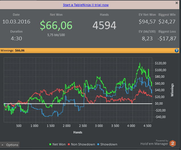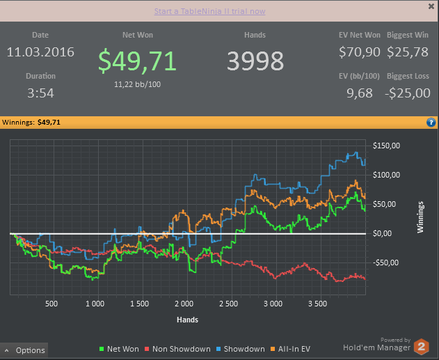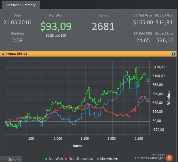 Неделя выдалась ужасная, раза четыре переустанавливал винду, и еще больше холдем менеджер , все из за того что хм2 , вис просто нереально вис , раньше по 2 млн рук было и все работало хорошо, а сейчас всего 200к и все, играть невозможно , решение проблемы все же нашел , установил в десятый раз хм2 и не импортировал руки, вроде стало все хорошо , ну вот только придется немного поиграть без статов на оппов. По прифиту по ощущению 150$ залил , но это и не удивительно , когда у меня последние два дня были каким-то покерным адом , даже начинал подумывать что лучше бы в тильте немного злился и то чувствовал бы себя лучше , еще в добавок к том на компе не могу зайти на джипси, все из за того что какое-то количества раз ввел неправильно пароль, теперь им надо в суппорт писать .Наверное еще пару дней писать не буду , с планшета как-то не удобно, да и раздачи не выкинешь,да и еще на знаю как теперь отчет за месяц писать , профит то примерно можно подсчитать , а вот бб/100 уже нет ( .