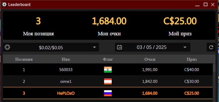 @Torchidze, что касается 9 часов, это точно не про меня. Вчера снова играл лидерборд и специально посмотрел сколько очков набирается за час игры на 6 столах. У меня с моими нитовыми статами вышло 100очков, что равно 15 часов игры – 1500 очков, что в итоге оказалось мало.