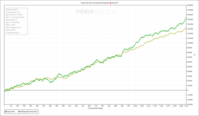 Для игры в спины желательно иметь железо-бетонный БР на всех лимитах, так просадки могут быть страшными. Сейчас я катаю нон стопом 4 стола и не обращаю внимания даже на 23 поражения подряд, что позволяет продолжать катать в оптимальном состоянии, поэтому буду придерживаться железо-бетонного БР и для других лимитов. В планах появилась мысля попробовать стримить свою игру, возможно кому- нибудь будет интересно, но пока не представляю, как это технически сделать, надо обратиться за помощью к гуглу. Пообщался с тренером, он сказал, что давно надо было переходить на спины, а не строить себе иллюзии, и катать в соответствии с "трендом" на рынке. Как человек, занимающийся еще и рынком "форекса", понимаю, на сколько важен "тренд", так что это применительно и к покеру. В любом случае, я не жалею время, потраченное на обучение в Хедзап, так как это сейчас здорово помогает в новой дисциплине, да и вообще я думаю поможет в любой другой, где приходится оставаться с игроком тет-а-тет. Всё, выговорился! Всем желаю добиться своих целей и лимитов!