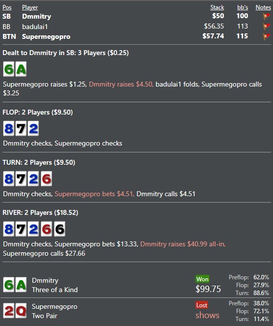 вчера сыграл пиздец-сессию, дрючили в одну калитку, 2 любителя по 4 и 5 стеков отожрали у меня, в середине сессии вообще поплыл, стал разномастное говно заводить, но потом каким-то чудом отыгрался :) Как я понял, что есть реги которым пофиг на сайзинги 3бетом и 4бетов, они все равно в банк зайдут.