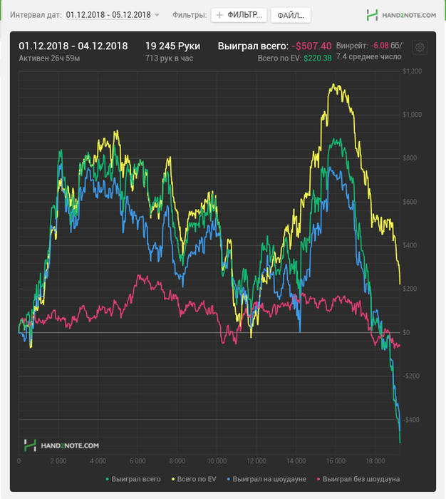 Рыбак рыбака видит...))) На графике только 50? Какая самая большая просадка была у тебя на рег столах за сессию/день, играя в такой дисперсионной манере?