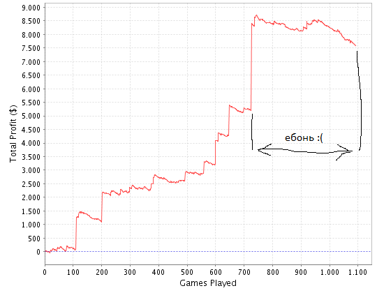 Месяц началcя хреновенько, надоело депить на покерстарз, по графику видно, что там даун у мя почти 400 игр и минус больше $1к при АБИ $10. а это довольно много, в алынах естественно жутко не везет, а в килополях выставляться приходиться часто. наверно хотят, чтобы назад весь выигрыш задепил Прошу палочку вверх, да подлиньше