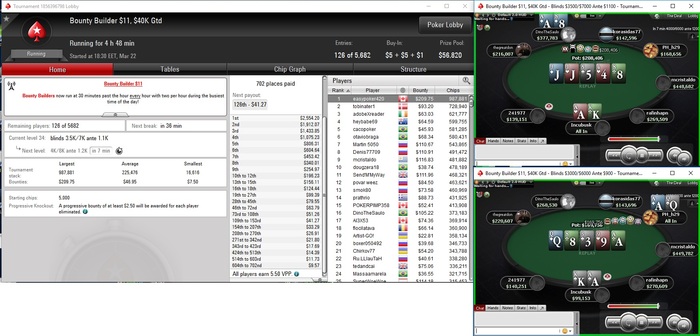 Прошел во 2ой день турнира(Уже в деньгах).Стэк чуть меньше среднего.Была одна интересная раздача под конец дня.Я открылся с УТГ с КДо,МП+1(достаточно активно играющая девушка) - колл.Все остальные пасс.Флоп 976 бубновое ФД,я цбет,там колл.Тут я решил со всеми сэтами он бы переставляла флоп,т.к. боится ФД и ОЕСД,оверпары отпадают,с ними был бы 3бет.Так что я решил ставить 3 барреля со своими КДо(без бубей),в блеф по бланковым улицам,терн 2 червей.Я 2ой баррель,ривер 3 червей и поставил третий.Она немного подумала и выбросила,а я забрал большой банк :)