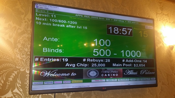 Удовлетворяем очередное пожелание игроков - теперь на главный турнир месяца, 500уе, 15000уе гарантия, можно отобраться онлайн! Каждый день, в 17.00 по москве (в 21.00 по нашему), на RedStar Poker, будет проходить сателлит в формате 20$ R&A. Ищите сателлит в разделе турниров, вкладка Satellites\Live Events. Сателлит называется: Altai Palace Poker Club satellite 1 пакет в 500$ будет включать в себя вход в наш оффлайн турнир по 500уе + 2 суток проживание в нашем отеле! Минимальное кол-во участников в сателлите - 6 человек. Если 500$ не набирается - то призеры получат выигрыш деньгами на свои счета. Если в призовом фонде набирается 500$, то формируется пакет и деньги отправляются на наш счет и обладателю пакета надо будет только прислать свои данные для регистрации. Спешите отобраться - первый турнир в нашем клубе пройдет уже 4 февраля! Пакет онлайн сам по себе очень привлекателен. При курсе доллара в районе 60 рублей, пакет выходит в 30 000 рублей. Из них 25 000 рублей - это вход в турнир, а за остальные 5000 рублей вы получаете номер на 2 суток!