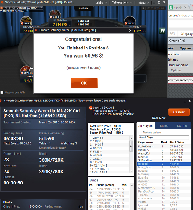 Всем привет! отбилась я что-то от рук совсем. Зима влияла своей депрессухой, но я вернулась в дело))) и теперь радостно, что теперь гружу еще и турики за 2$ На самом деле стоит развилка какая-то. Мтт я очччч люблю, но время выделять становится сложнее, хотя это всё отмазки и вопрос самоорганизации. Постараюсь катать 3 дня в неделю хотя бы стабильно. (или подумываю о спинах но это не точно) Скучала по вот этому на самом деле! Сессии будут небольшие пока БР не достигнет 330 уе , чтобы еще брать и по 3 уе турики. за 1-2 уе к сожалению на пати покере не так много туриков ,но есть!!! и вроде как плюсую, хоть и очень слабо, ну а на ПС конечно килополянки целиком грузить точно не стану. Еще что заметила, играю фрироллы в малоизвестном руме КоинПокер, так вот почему-то лучше тащу Омаху... сегодня например 1 из 377 кончила)