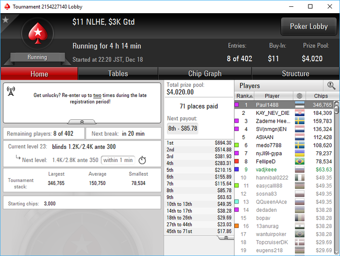 МТТ как бы разделилась на 2 сессии. Пока загружался, там где регался в лейтрегах, прошел до ИТМ и уже отбил сессию но так и вылетел в 1м заняв 18место и с 2х до 3х загружал еще турниры и саты.