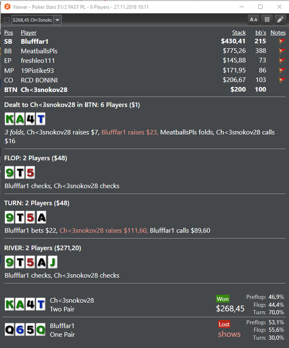 С такой рукой тоже не сахар чек колить. Поэтому ее донкаем 50% и фолдим на пуш. И кстати говоря если на терне приходит