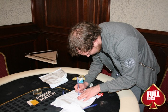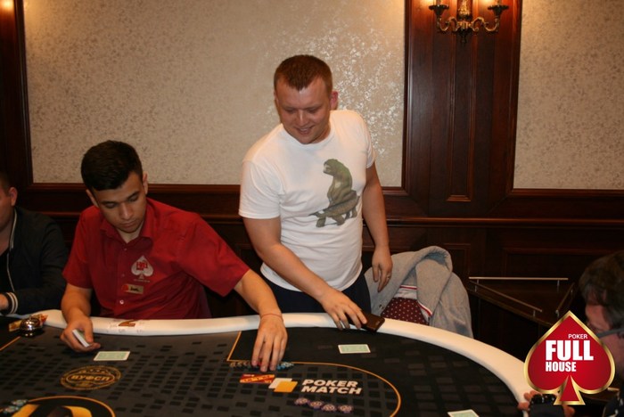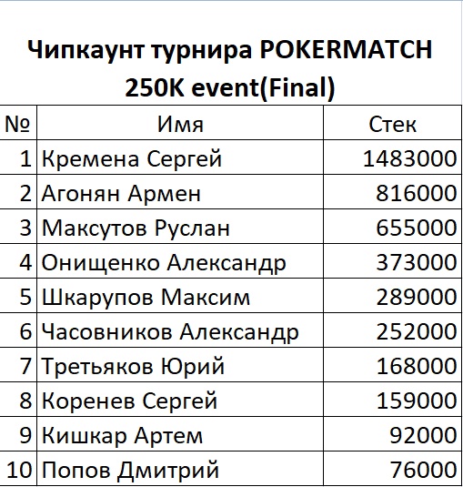 Финишировал у нас День2 турнира PokerMatch 250K Event В финальный день перешло 10 человек В последней раздаче Сергей выбил Макса, который начинал день чип-лидером У Сергея 1,4 млн фишек и теперь он возглавляет список А вот у Димы всего 76 000, но он не унывает. "Еще раскрутимся", - говорит Завтра последний стол турнира начнет борьбу в 15:00 с блайндов 6 к - 12 к.