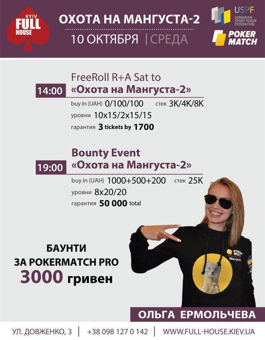 Завтра тот редкий случай, когда вы сможете застать Олю за покерными столами нашей столицы, пообщаться с ней, зарядиться позитивом от этой веселой и открытой девушки, а также получить 3000 грн “баунти” за ее голову. Турнир “Охота на Мангуста” начнется в 19:00, а в 14:00 у вас есть шанс выиграть билет на целевой турнир во фриролле.