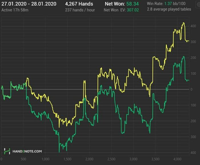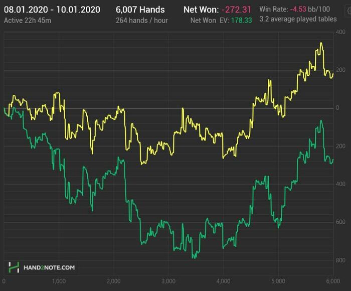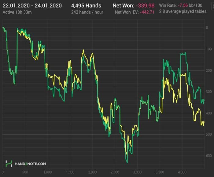 Отчет за январь В этом месяце появилось много свободного времени, что более менее позволило вернуться в каточный режим. С одной стороны я не сильно доволен, ведь на покер ушло всего 126 часов (115 - катка, и всего 11 - теории). Но все таки это уже на час больше чем в декабре, и внимание, больше я катал в последний раз лишь год назад! Год сука! При том что это всего 126 часов. Чем я занимался все это время...
