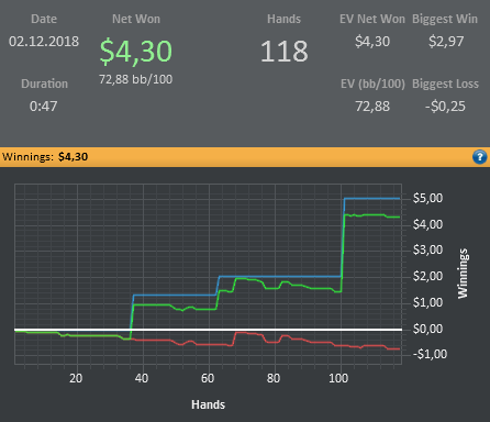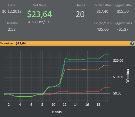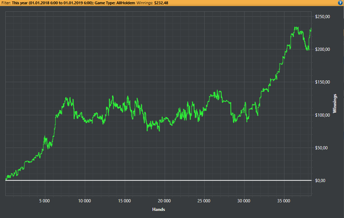 Итоги 2018 года: 1) 3 месяца откатал в плюс на китайском Покермастере на лимитах 1-2-4, 2-4-8 (~NL130) 2) Побиты NL2, NL5 и NL10 3) Плюсовые шоты на NL16, 20 4) Покатал немного MTT в плюс 5) Немного МТТ в оффлайне в плюс.