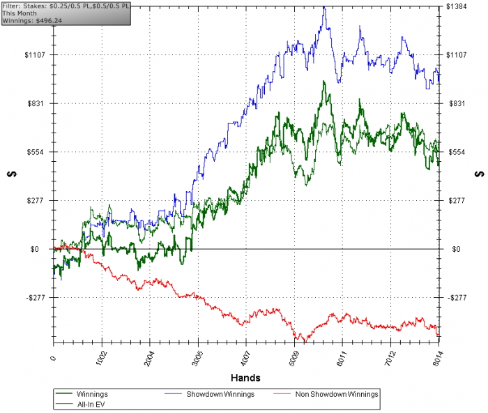 Судя по всему мой уровень на данный момент это 4 стола одновременно, около 1000 рук в день, игра 5-6 часов. На данный момент по ЕВ винрейт 15бб, но похоже все же можно иметь больше, т. к. судя по графику я на этой неделе упорно воевал за банки и потому красная линия идет горизонтально. Возможно, если ее немного отпустить, то зеленая пойдет вверх быстрее, как на той неделе.