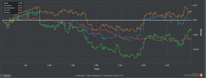 Уже на протяжении двух недель веду дневник ошибок, сегодня анализировал все записи, самая распространенная - переигровка рук. У меня есть четкая стратегия, я могу трезво разобрать раздачу и указать на свои ошибки, но вот протащить 2 пару до ривера, только потому что в поте фиш, а фиши склонны блефовать, а блеф хочется вскрыть, да еще и банк уже 20бб+ и забрать хочется, зачем фишу отдавать. Примерно так я и договариваюсь сам с собой. Обычно такие ситуацию происходят на автомате. Пока придумал закрывать все сразу чтобы осмыслить, что вытворяю, сегодня вообще поставил себе ограничение на 12ч, чтобы неповадно было. Если у кого схожая проблема и он ее успешно преодолел, буду рад совету, а то заебало каждое утро, при разборе, видеть одни и те же ошибки.