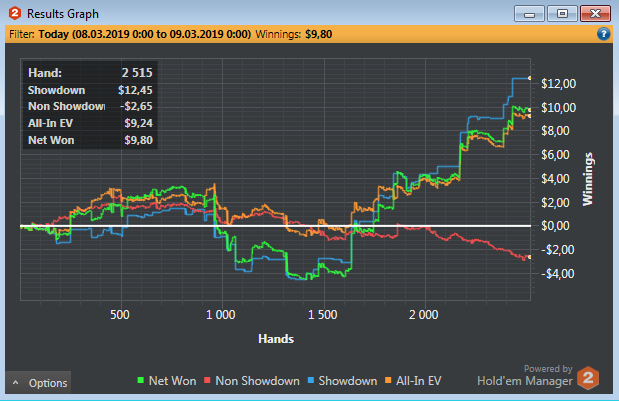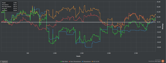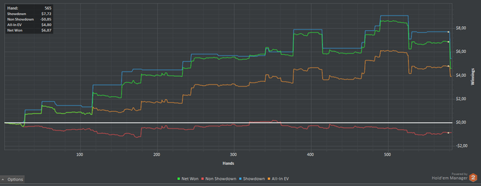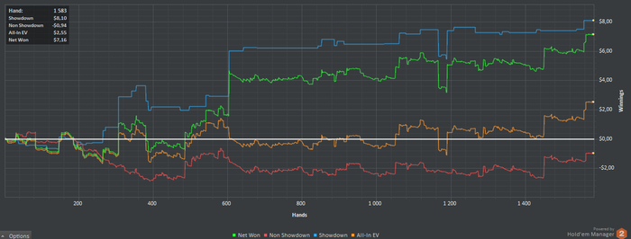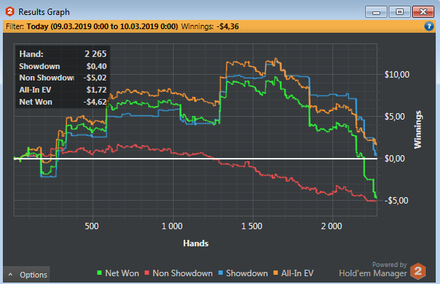 Изначально планировал играть мало, несколько столов. Все шло прекрасно, тщательный селект, 3-4 стола, даже заходило неплохо. Но как-то очень быстро, из-за своих ошибок, не поверив в руку оппонента, я отдал на пустом месте 2 стека и на этом решил все, поработаю лучше над игрой.