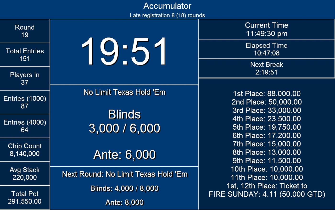#AccumulatorFinalTable На 6-м месте своё турнирное шествие завершил Александр. Он запушил 4 бб с пиковыми Q9 и получил колл от Вадима на большом блайнде. У Вадима оказались AJ. Флоп с тузом На терне Александру открылось бэкдорное флеш-дро, когда вышел Но на ривере вышел ещё один валет, закрывший Вадиму фулл хаус.