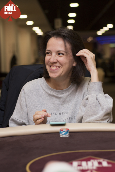 #AccumulatorFinalTable На 8-м месте из турнира выбывает единственная девушка – Катя. Она долго фолдила руки, пытаясь найти удобный спот для удвоения, но в ключевой раздаче события развивались следующим образом: Дима Сокирко с катоффа лимпит. Катя смотрит на свои карты и говорит Диме: "Чтоб тебя в баню! Первый раз лимп за финальным столом". Но все же задвигает свой олл-ин на 5бб. Дима коллирует с У Кати и отличная возможность для удвоения. Ровно до флопа: