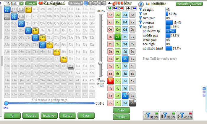 Вот по риверу, просто сдался, думал там и часть КК+ в позе будет мой трибет колить и сетики все без проблем колят и не рейзят флоп\терн. Правильно ли я сыграл? Я думал выбью ТТ 99 ну там нижние пары, Ах, т.к. я особо не выбивал их по флопу. Но вот флопзилла покажет сколько у меня там ФЭ против среднего спектра кола трибета в позе МП против ББ Сводка к флопзилле, тут спектр оппа и видно, что если он по тёрну тянет свои ТТ 99, 87s, 89s, то по риверу он на бет нормально может колить только 40%, и 60% ФЭ ривером у нас получится, солидно.