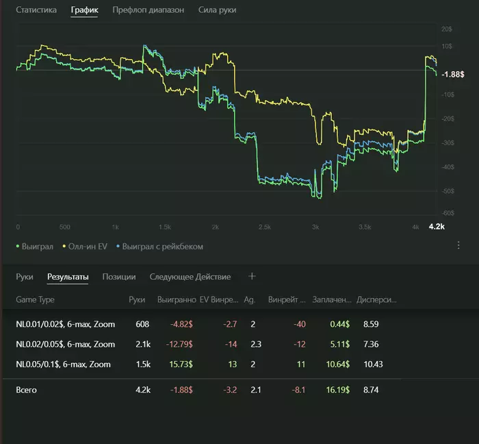 BAHAKC @ 17.02.24Там в конце резкий подъем в графике, конечно очень редко, но бывает такое из-за того, что в дипах или в мультике затащили большой спот, но чаще это бывает, когда человек заливает всё сессию, а потом идёт на 1-2 лимита выше выигрывает стек/два и заканчивает.