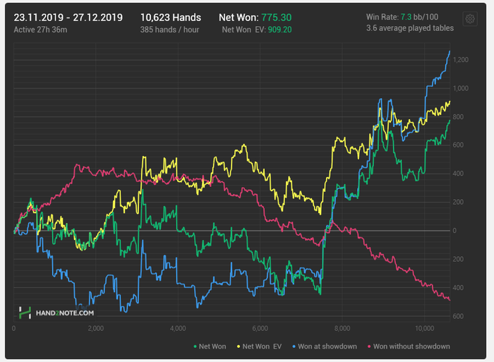 Всем привет! Сегодня сдан последний зачёт и теперь я свободен! В воскресенье уезжаю в Череповец. Потихоньку поигрываю и собираюсь наращивать темпы. Выкладываю результаты последних 10к рук (с 23 ноября, когда я решил играть без коллов). Кстати говоря, автоматически вернулся к коллированию, не могу сказать много или мало, смотрю по максимизации EV. Если колл в определенной ситуации считаю выгодным, тогда его стоит сделать. Таким образом не вижу особо смысла смотреть на мою статистику, если результат (конечно нужно побольше дистанцию, чтобы судить) устраивает.