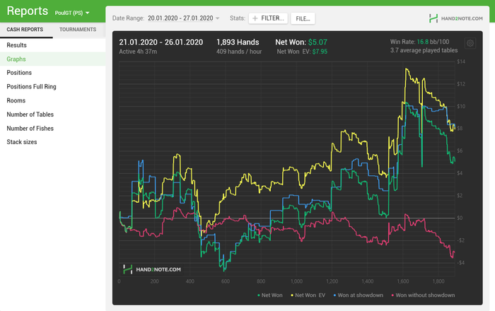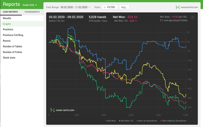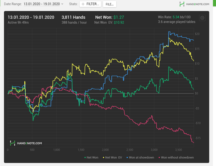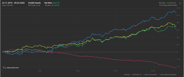 На NL2 я так понял нет смысла изощряться, я хорошо изучил оппонентов и теперь интуитивно (подкрепляя статистикой, если она есть) могу выбирать оптимальные действия. Вместе с этим красная стала ползти вниз, думаю не буду на неё обращать внимание, пока не перейду на NL5. По ощущениям это бессмысленно и только навредит. Скоро дочитаю книжку по сдвг и, наверно, начну что-нибудь про покер почитывать.