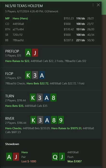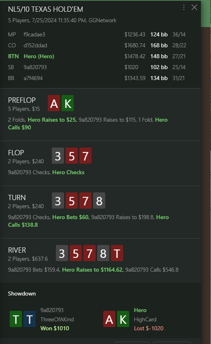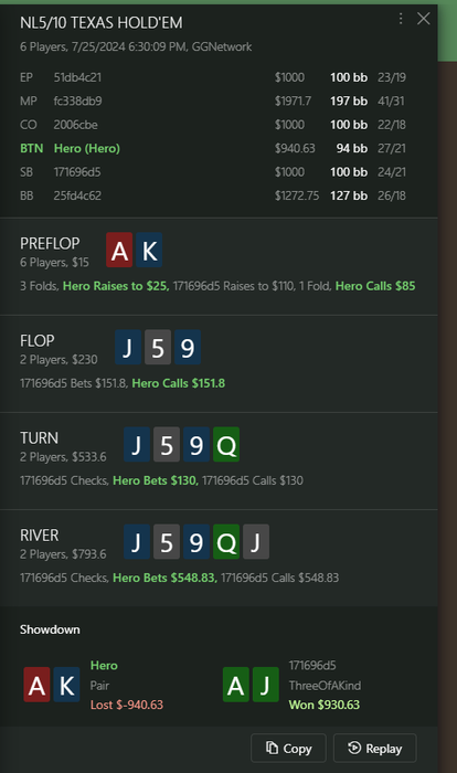 И хотел еще спросить по последней раздачке, а вообще то как опп сыграл префлоп со своими А4 в толпу где слабый игрок еще и сайз такой скромный это норм?
