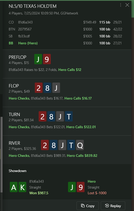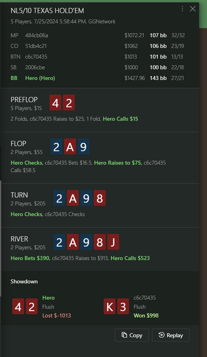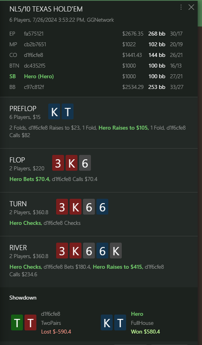 Флоп стандарт с его рукой, да и в целом у него в такую доску должен быть низкий к бет в этих позах, в мультике особенно, по другому ему флоп наверное и не сыграть, учитывая мой бет в толпу, единственный вопрос по терну, на мой взгляд он подходит больше 3 беттору и со всем диапом можно играть уже донк, что бы не получать чек бих, который будет очень часто, именно из-за того что К дает перевес ББ. Ривер с его рукой без вариков, надо блефовать, мой колл не скажу что печатает деньги, но думаю околообязательный, после чека терном у меня конечно все еще будут сеты на ривере, что бы отбить, но этого явно не достаточно, так что моя рука или КДс, вот и все с чем мне есть колить.