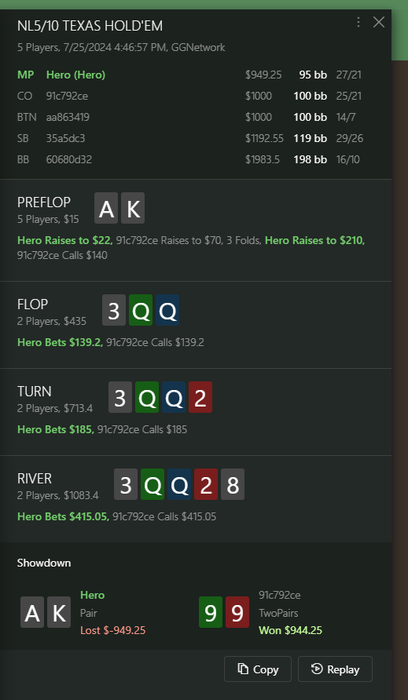 Блин, я б каждую раздачу иначе сыграл, но в твоих размышлениях тоже логику понять могу. Замечательная всё-таки игра, этот наш покер. :D