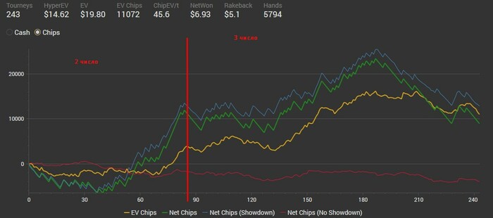 Словил несколько диких серий поражений, но зато показал чип ев (рекордный для меня). До отыгрыша первой части бонуса осталось ещё больше 700 турниров Так что буду продолжать