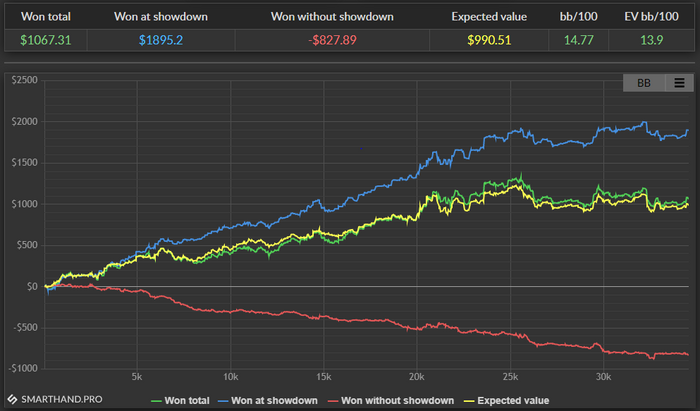 В зуме меньше информации, селекта, динамики соответственно винрейт ниже, дисперсия выше. Мы можем понимать что происходит в целом на лимите за рег столами воспользовавшись сайтом статистики, что происходит с винрейтами регов в зуме мы точно не знаем. Кстати может кто из читающих это поделится графиками. Из моего опыта я отыграл на микро лимитах несколько миллионов рук с винрейтов 3BB\100, но это было давно. Если всё таки соберешься играть в зум то важным факторов там будет время игры (лучшее после 20.00 мск) и в дипах мой винрейт был в разы выше чем в 100 BB
