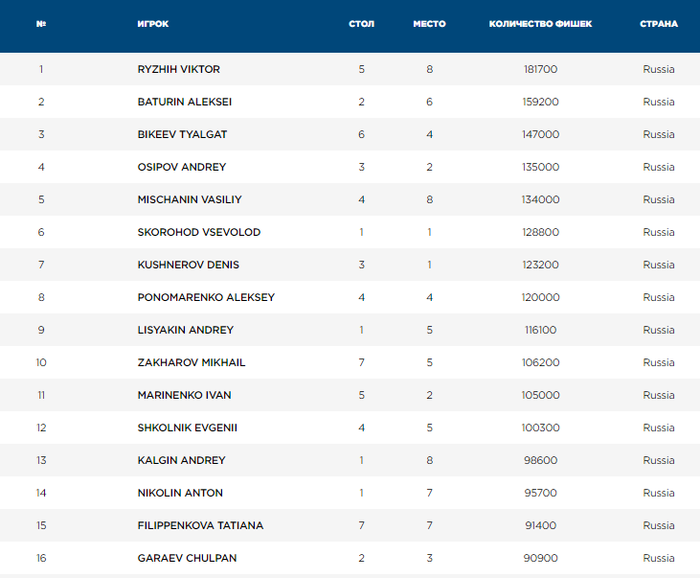Последним из сателлита вылетел Азамат Янгиров. Впрочем, утешительный приз оказался довольно существенным - 915 у.е. Остальных 11 игроков ждём завтра во втором флайте Мэйна.