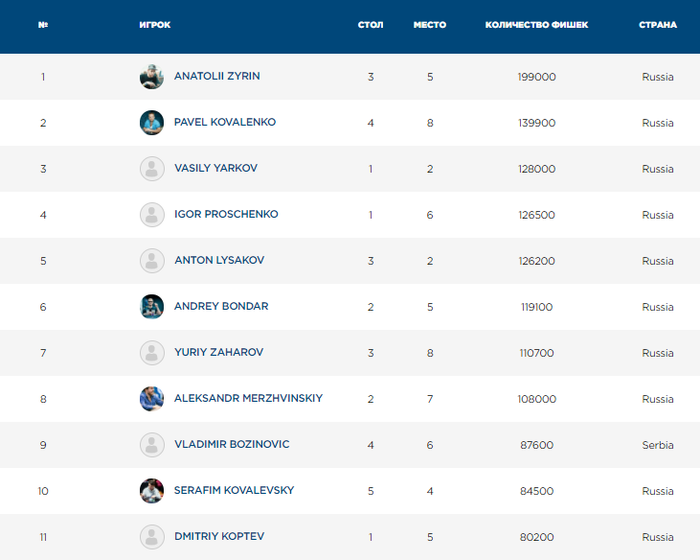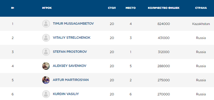 Подошёл к концу и стартовый флайт Главного события. Было сделано 60 входов, 30 человек перешли во второй день. Чиплидер - Анатолий Зырин, за ним располагается Павел Коваленко. Весь чипкаунт будет примерно через полчаса.