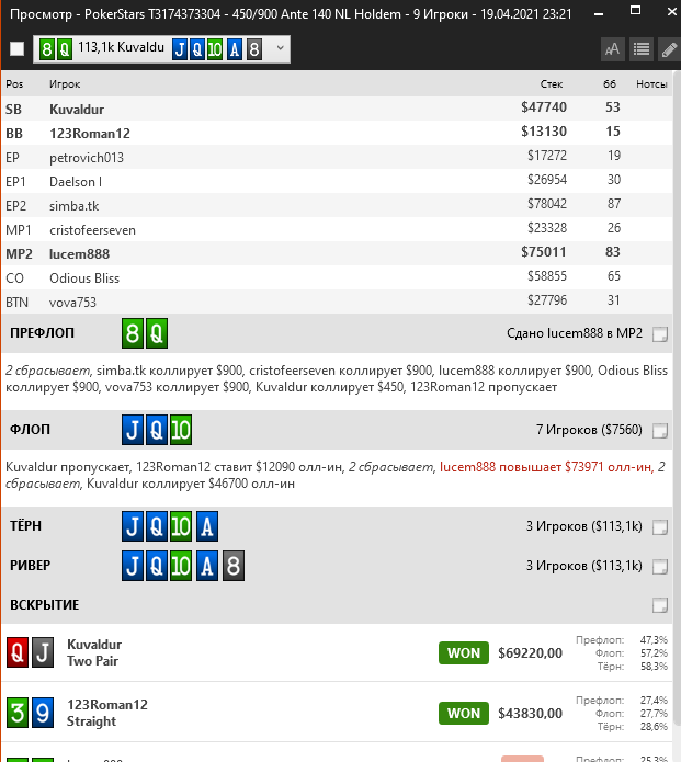 3. Самая тривиальная ошибка всех рыб, с которыми пересекаюсь в турнирах. В Deep (ультра медленный рост бб) и Big турнирах мой оллин часто закрывают очень широко, так, как будто за моё выбивание кроме фишек они получат дополнительный бонус, и это грубая ошибка в игре.