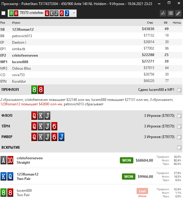 Если терном ты ставишь 1,5-2 бб и ББ всё-таки сыграет просто колл, то ривер оппонент со стритом и со стеком в шесть раз на старте больше твоего НИКОГДА не будет чекать, он всандалит в тебя оллин на велью - и ты скидываешь, понимая, что ты тут уже ничего не бьёшь, кроме чистого блефа. А какой там может быть блеф? Стол - радуга, всем 4-х доехал стрит, всем 2-х доехал трипс, всем А-2+ от фулл-хаус до двух лучших пар чем у тебя, так-как у тебя сейчас рука, это две пары Тузы и двойки, а там Тузы и тройки+ , которым ты проигрываешь. Ну а пост фактум - достаточно посмотреть на то, с чем игрок защитил большой блайнд с 7-4 офс.... no comments.