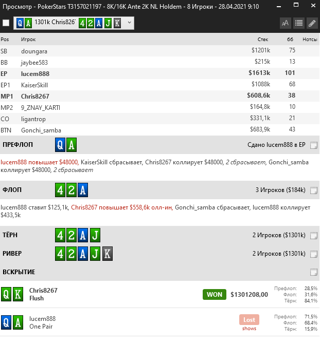 Ниже последняя раздача. Я сейчас понимаю, что это был пуш на префлопе... Но тогда сделала так