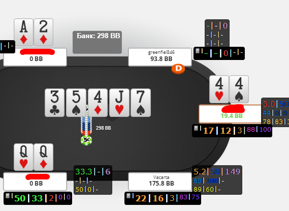 дамы опен рейз, все остальные колл, на флопе я (44) 3бет, дамы олл ин и все колл: